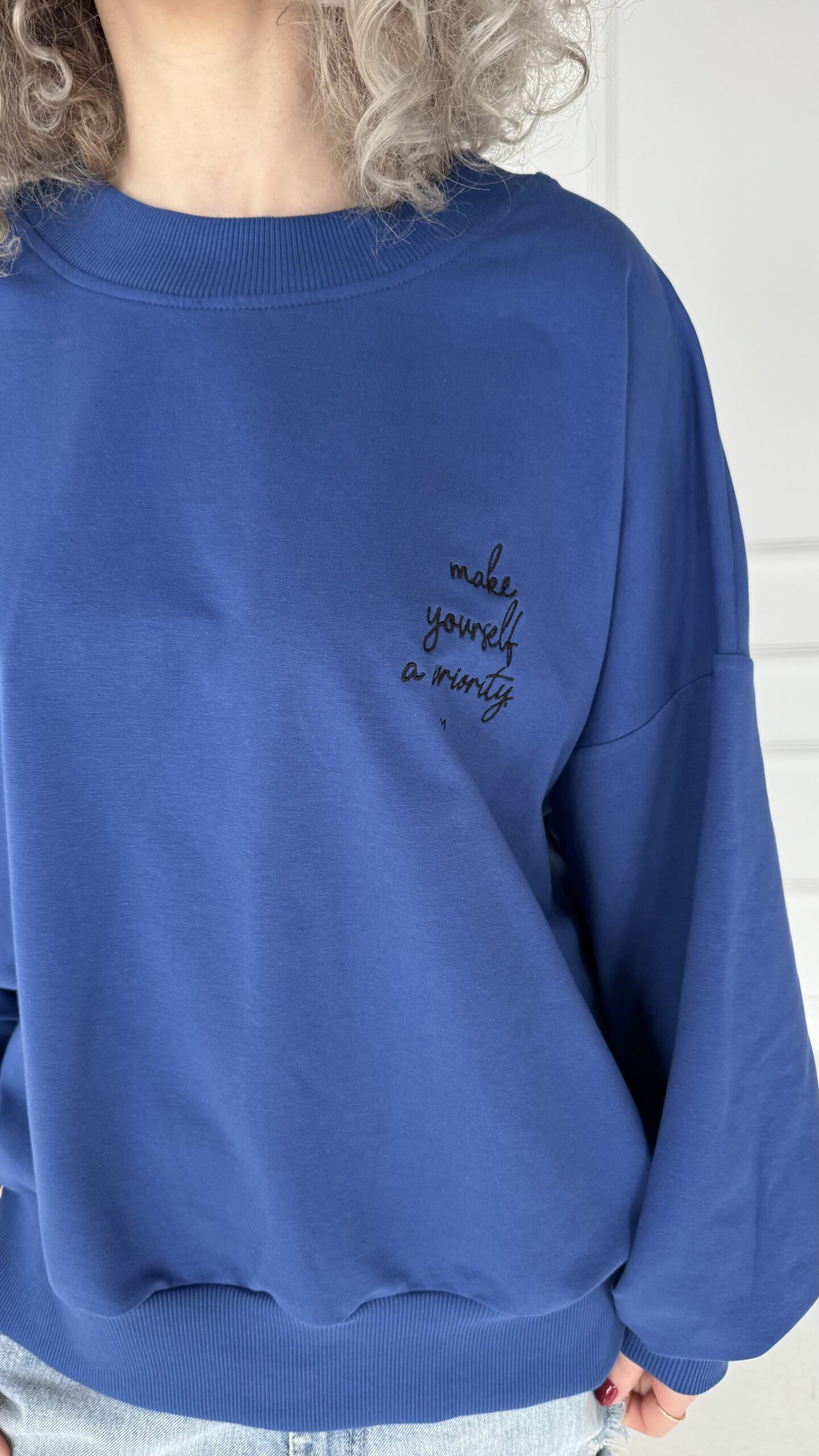 Mięsista bluza bez kaptura. Bardzo klasyczna, lekko oversize. Ozdobne hafty – na piersi oraz rękawie.