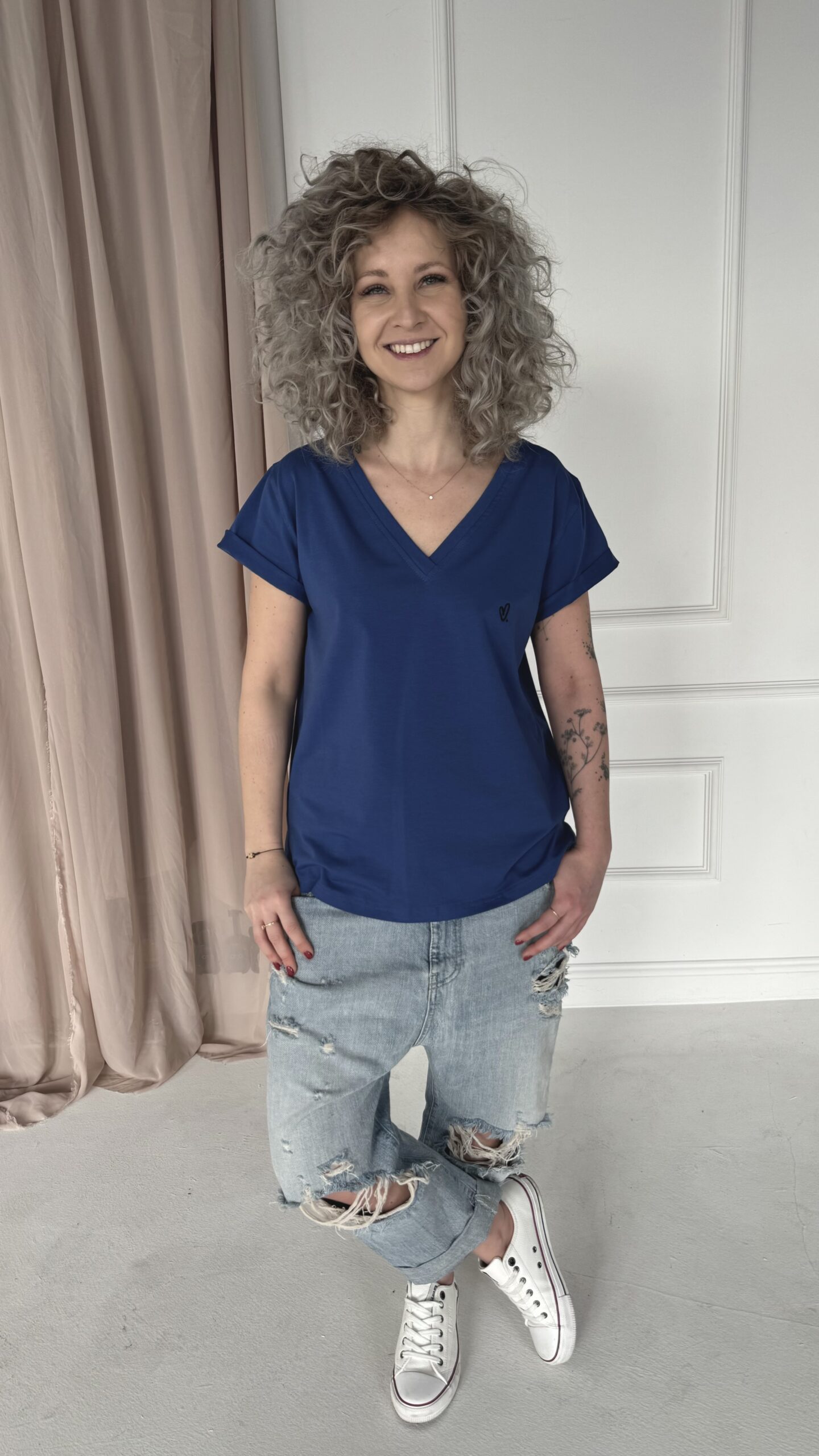 Nasza koszulka z dekoltem V stała się już z całą pewnością naszym bestsellerem. Model „HELENA” skierowany jest dla tych Pań, które nie lubią wielkich oversiz’ów i dużych dekoltów. Jednocześnie ma na tyle luzu, że nie opina ciała. Dekolt został podniesiony, tym samym stając się bardzo bezpiecznym. Po bokach rozporki. Z przodu ozdobny haft. Koszulka, którą śmiało założysz do pracy, pod marynarkę, do spódnicy czy jeansów. Wersja SLIM – tak bardzo klasyczna, że pasuje do każdej stylizacji.