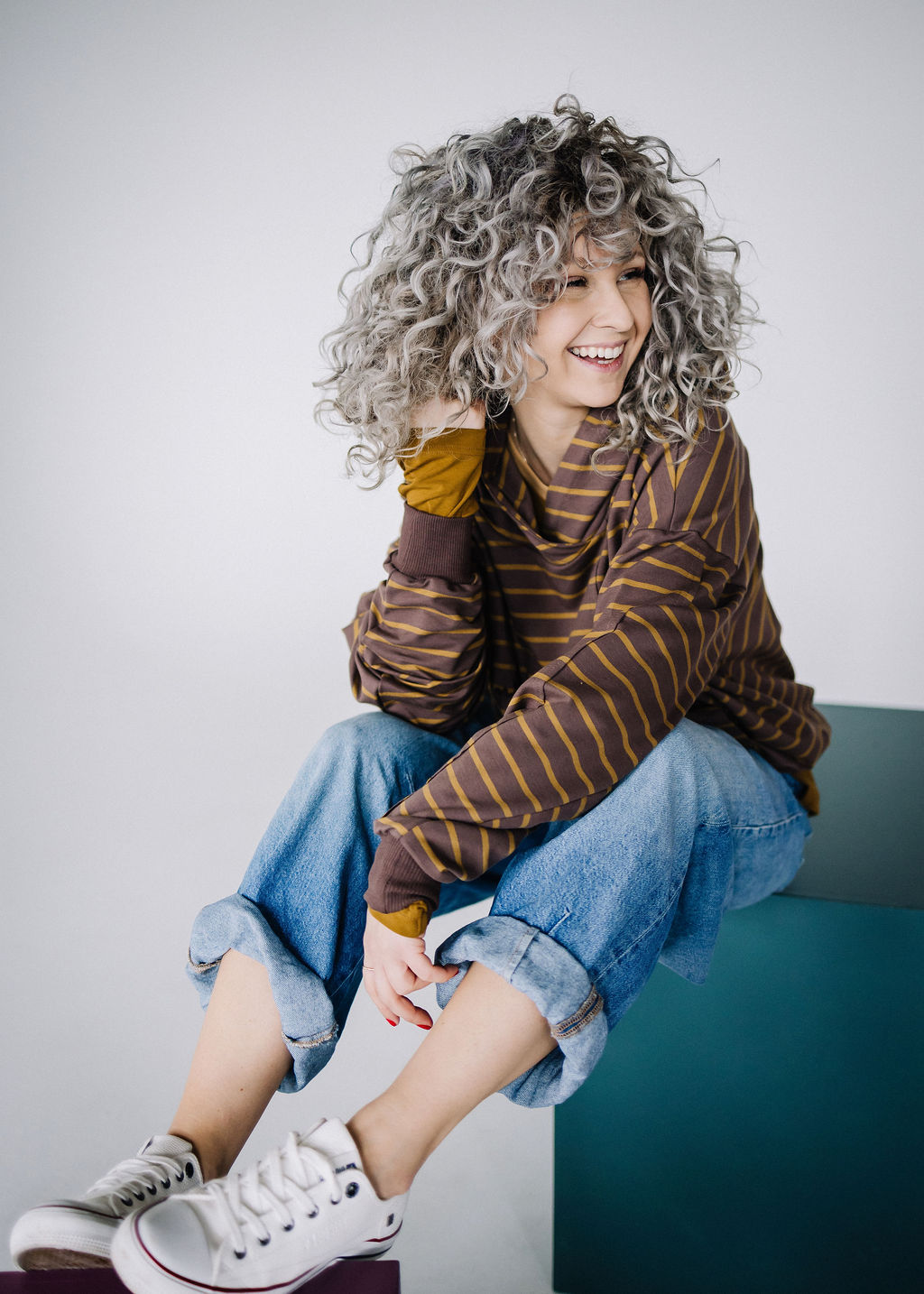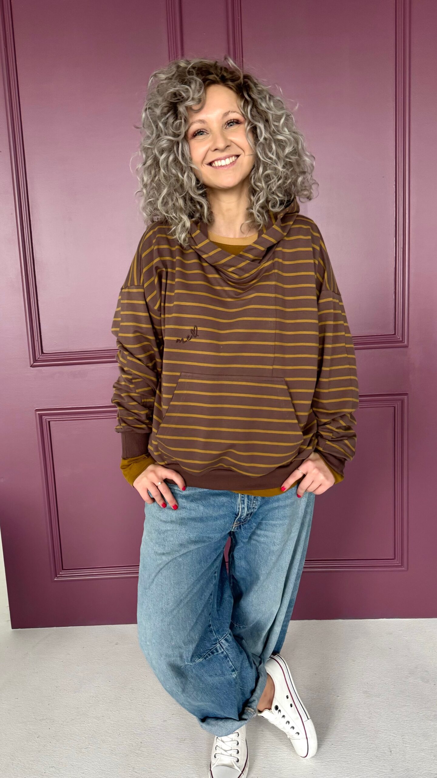 Mięsista bluza z kapturem typu kangurka. Surowe łączenia na przodzie, tyle i rękawach nadają jej niepowtarzalnego charakteru. Ozdobne hafty – na piersi oraz rękawie.