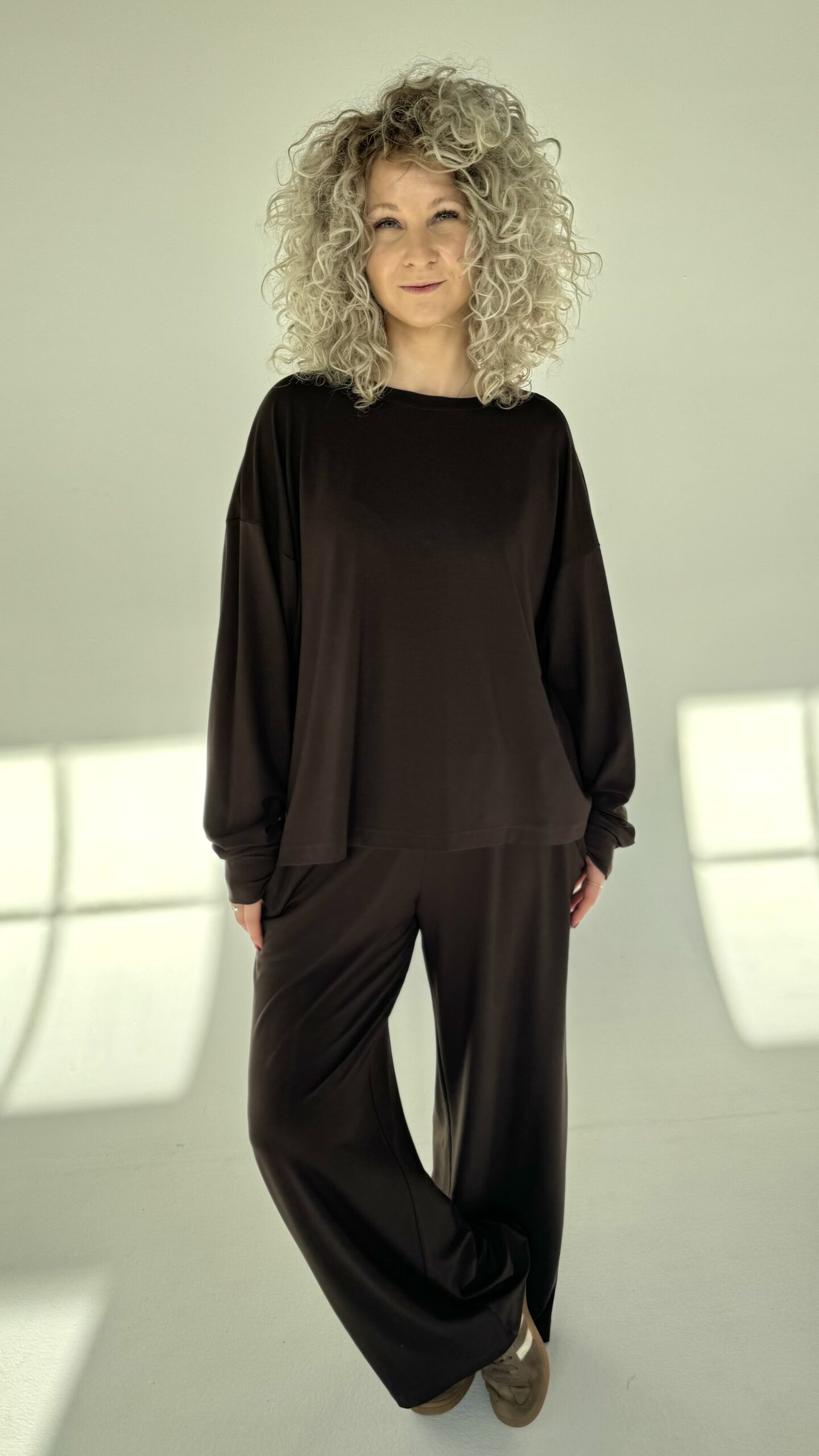 Połączenie wygody i nowoczesnego stylu. Długie, szerokie spodnie dresowe z lejącej dzianiny. Po bokach kieszenie, w pasie guma. Idealne w zestawieniu z naszą bluzą Loose Blouse.
