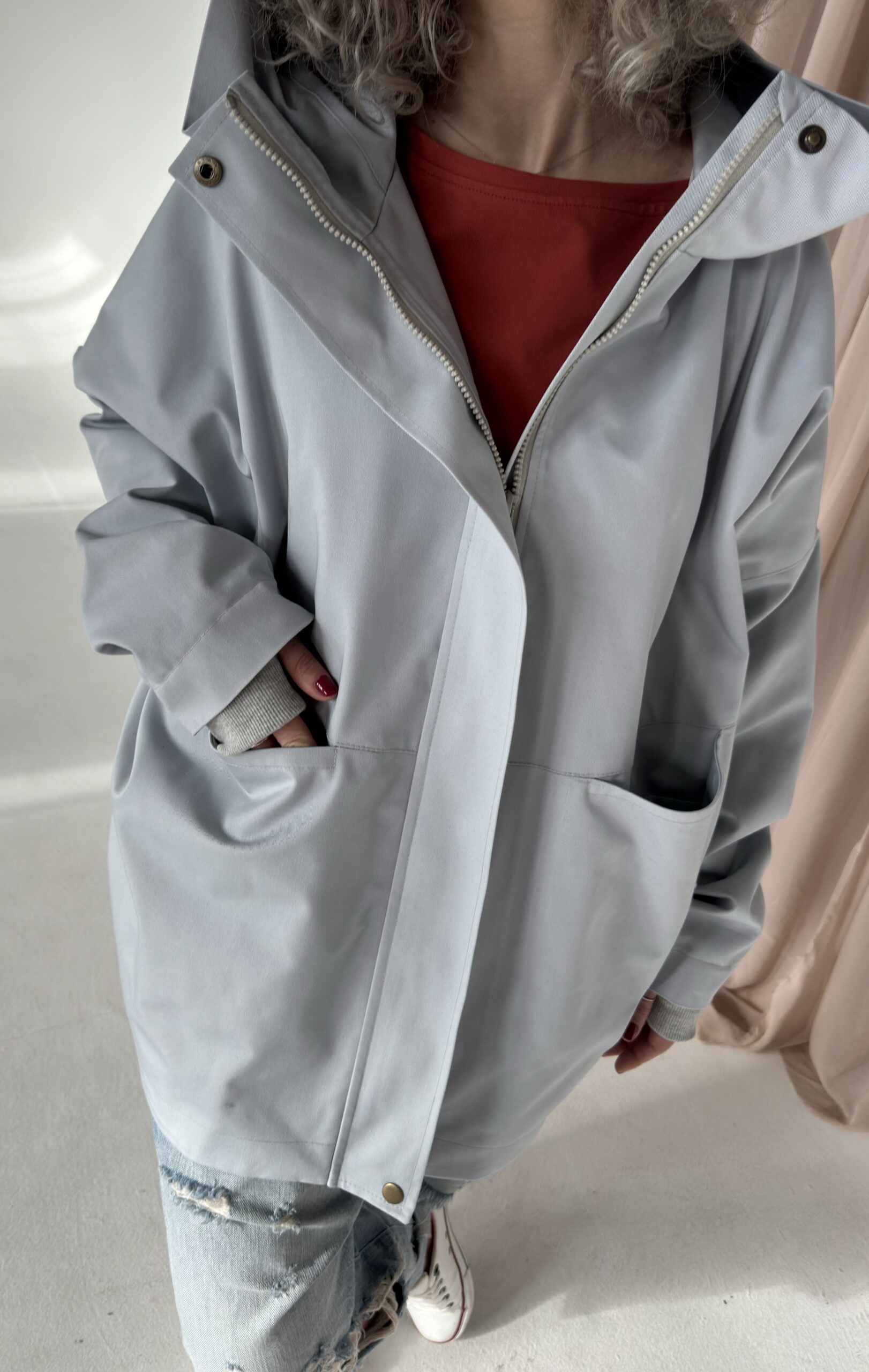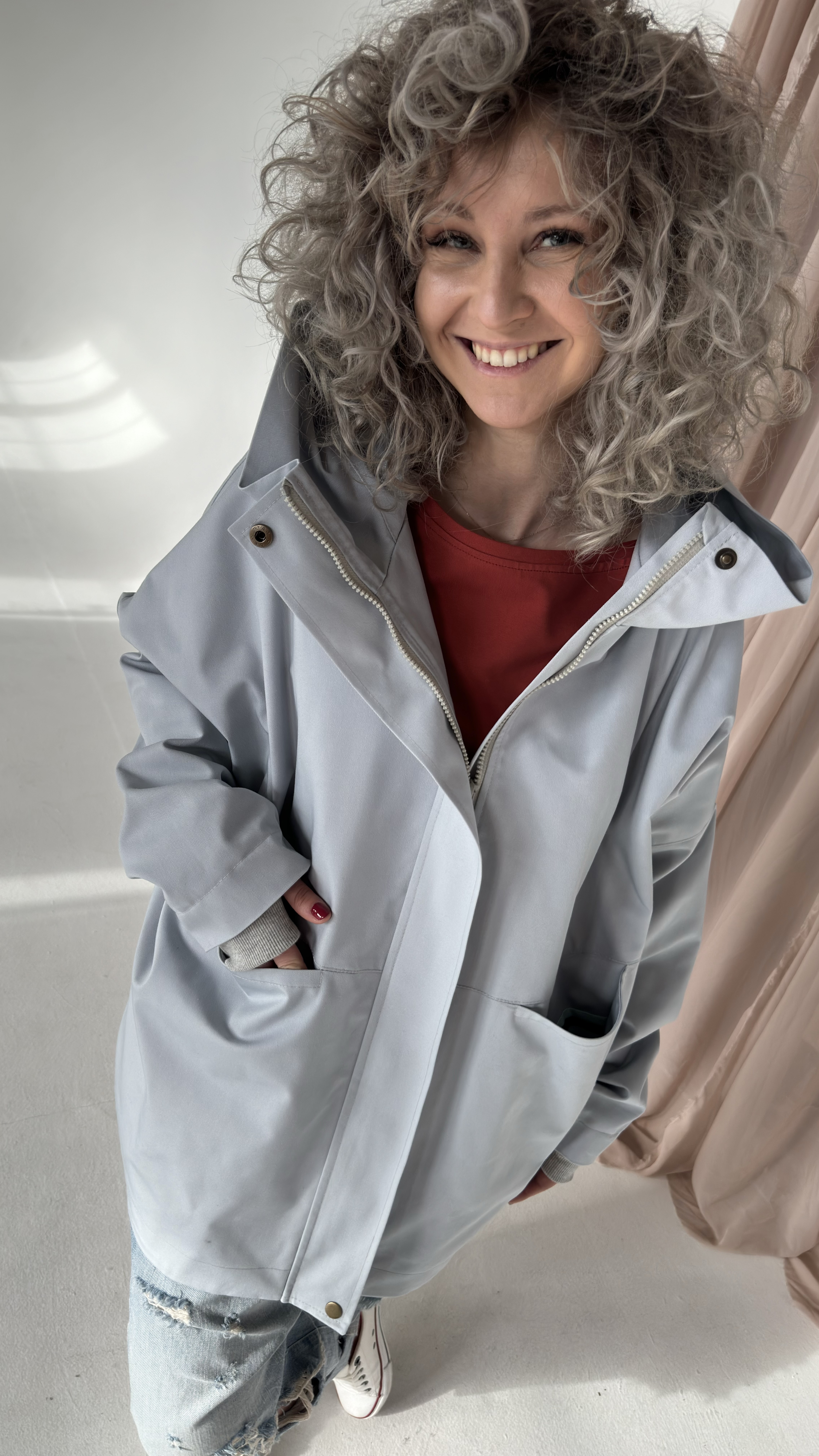 Lekka, wiosenno-jesienna, rozpinana kurtka. Wysoka stójka, głęboki kaptur z regulowana wokół gumką, ściągacze na dłonie z otworem na kciuki, głębokie kieszenie po bokach. Zwężana ku dołowi. Dłuższy tył. Od spodu bawełniana podszewka na całej kurtce (w losowym kolorze). W dolnym tylnym panelu gumka pozwalająca na marszczenie. Kurtka wprost idealna, świetna na codzień do sportowych stylówek.