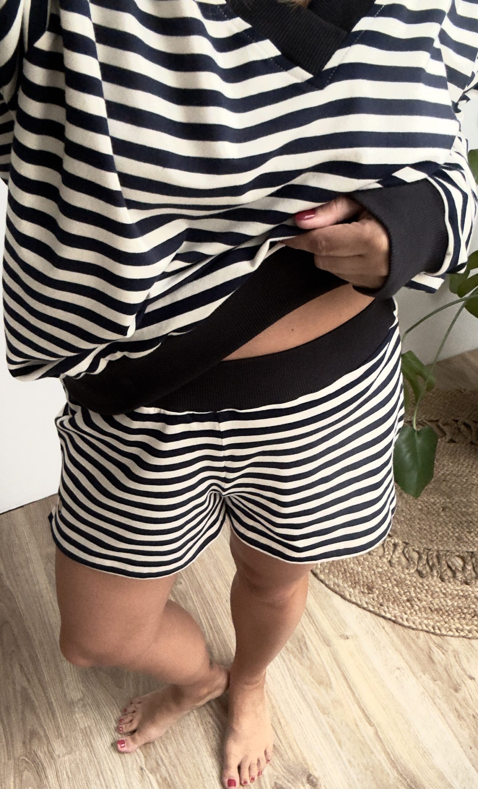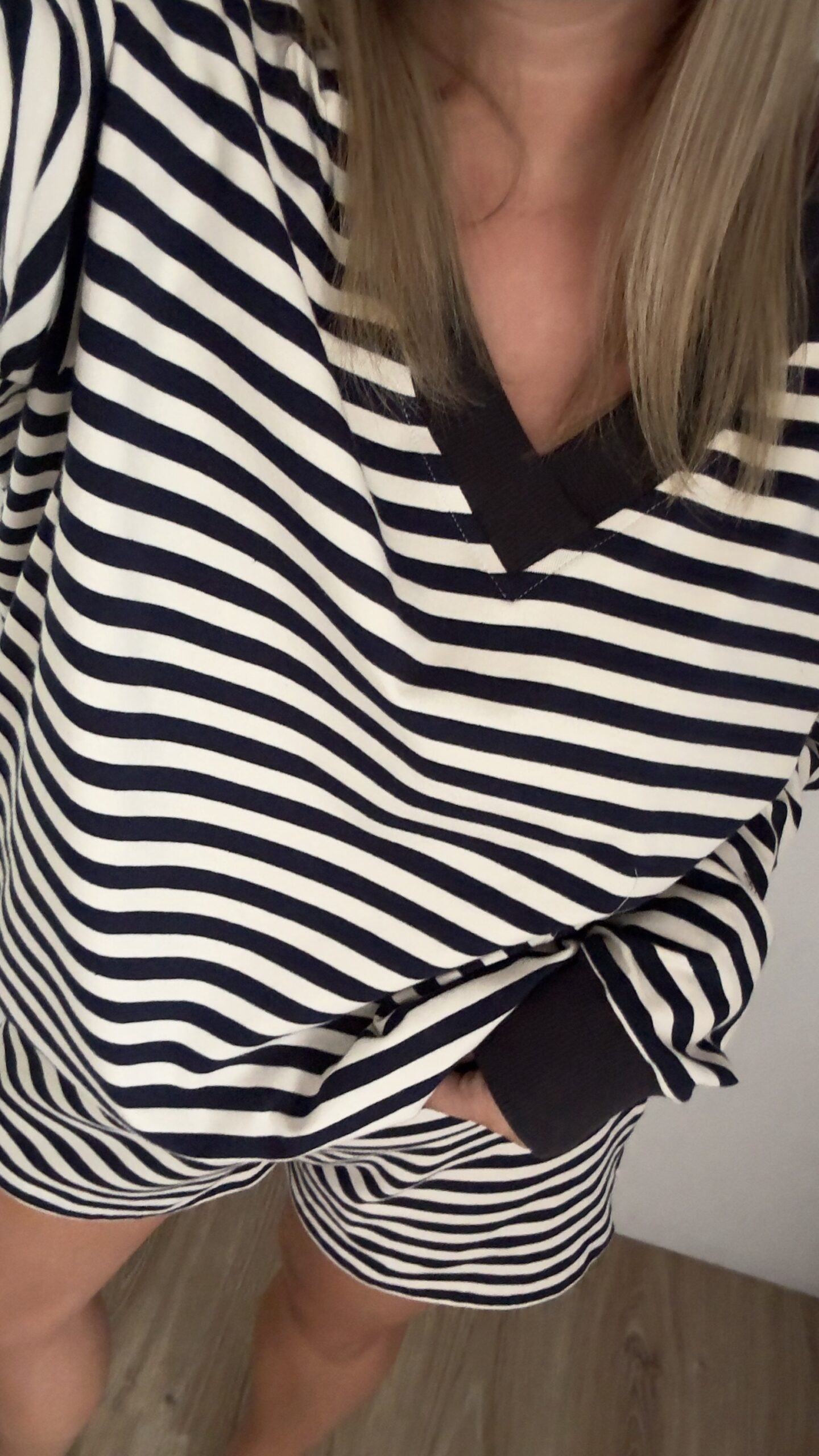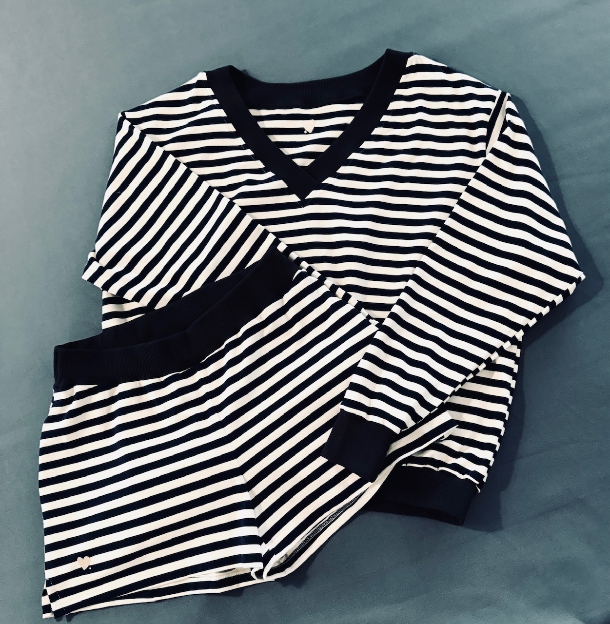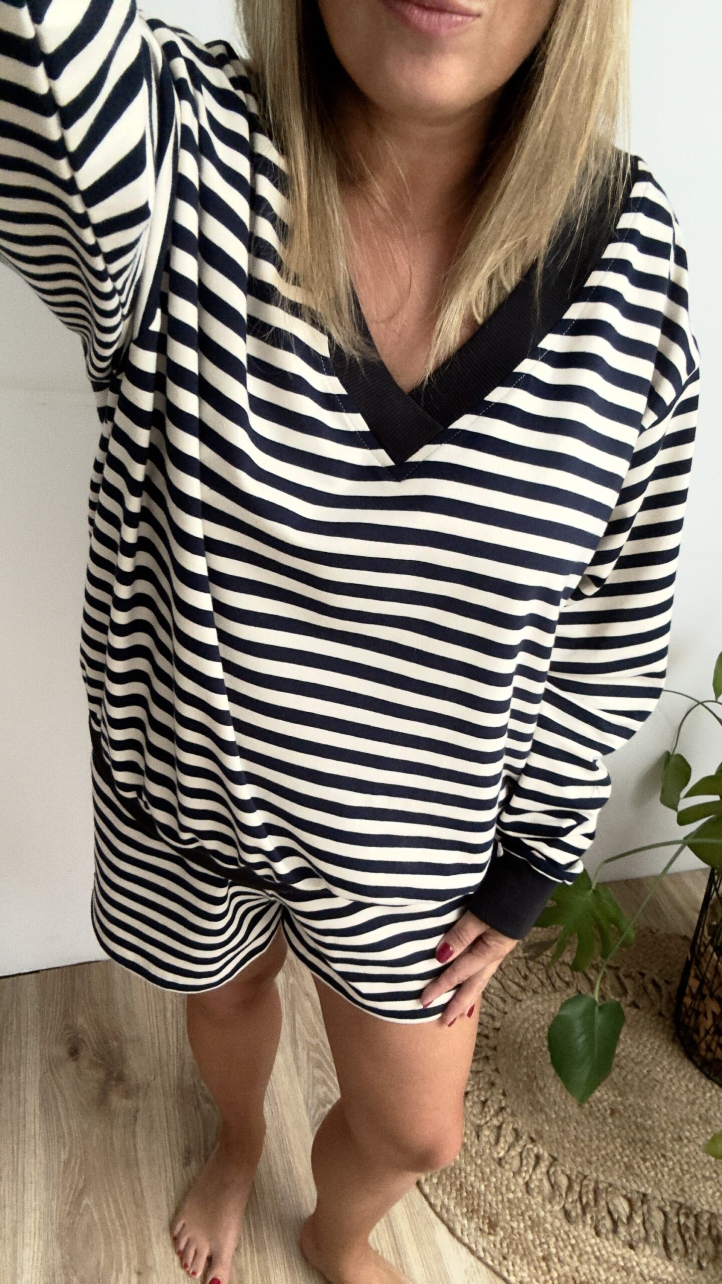 Wygodna, przyjemna w dotyku, oddychającą i co najważniejsze bawełniana piżama w granatowe paski. Oversiz’owa koszulka z długim rękawem. Wykończona ściągaczami na dekolcie, dole i rękawach. Szorty z rozporkami po bokach, w pasie wygodna guma ze ściągaczem. Ten zestaw to zdecydowanie inna piżama niż ta, która znajdziesz w sieciówkach. Zapewni Ci naprawdę komfort spania. Ilość zestawów limitowana.