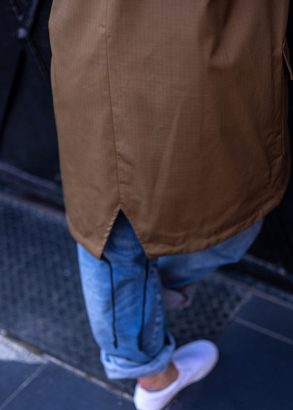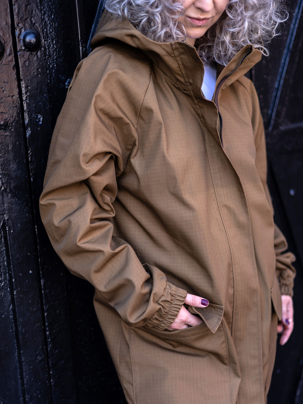 Zimowa kurtka typu parka o oversize’owym kroju. Duży kaptur i głębokie kieszenie umieszczone po bokach. Od spodu ciepły, czarny misiu, również na rękawach. Na dłonie ściągacze/ocieplacze z otworem na kciuk.