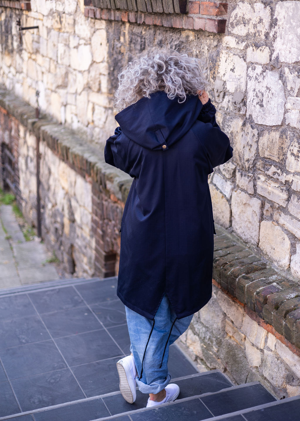 Zimowa kurtka typu parka o oversize’owym kroju. Duży kaptur i głębokie kieszenie umieszczone po bokach. Od spodu ciepły, czarny misiu, również na rękawach. Na dłonie ściągacze/ocieplacze z otworem na kciuk. Wersja wodoodporna.